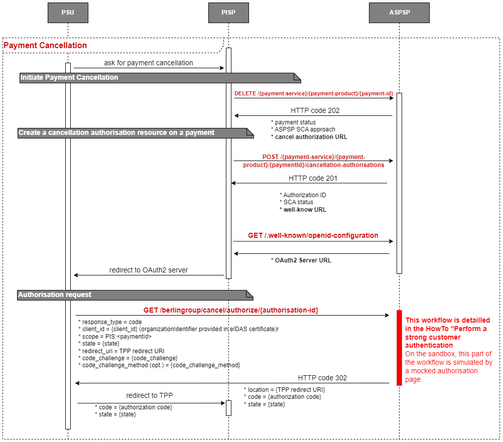 In this approach, the PISP has to proceed with an OAuth2 authorization. The cancellation request is established and validated thanks to a redirection of the PSU towards the ASPSP Authentication platform.